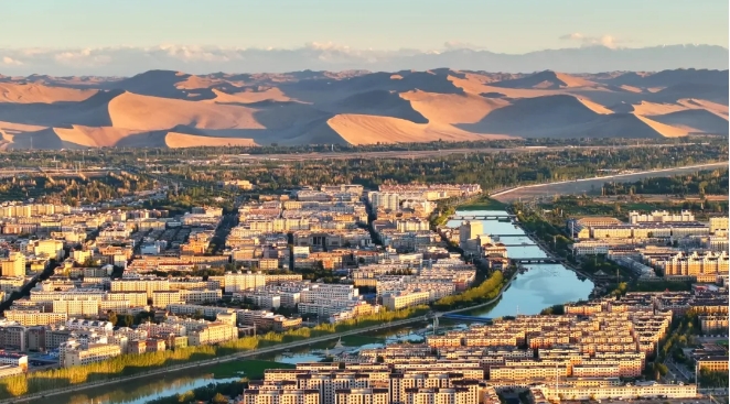 党河蜿蜒流淌,穿过城市